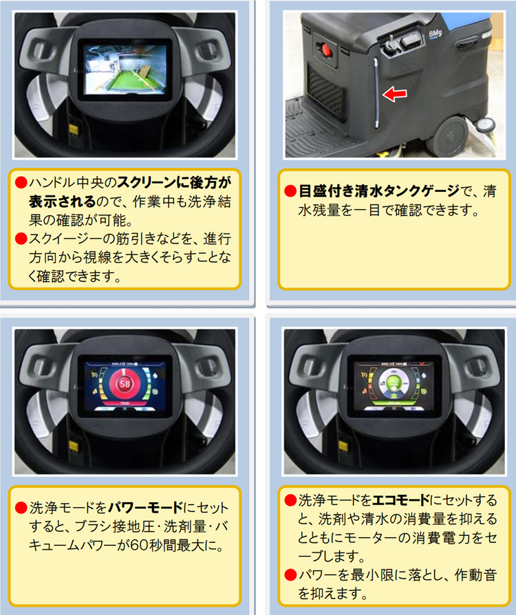 ハンドル中央のスクリーンで後方を確認しながら作業可能。スクイージーの筋引きも進行方向から視線を大きくそらさずチェックできます。