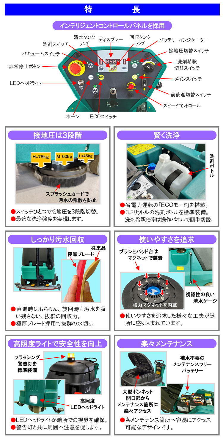 | 特長 | コンパクトで小回りが利く | 手押し式の中核モデル。長時間運転と扱いやすさのバランス型 | 自走式で移動負担を軽減 | 大型施設向け搭乗式モデル |
