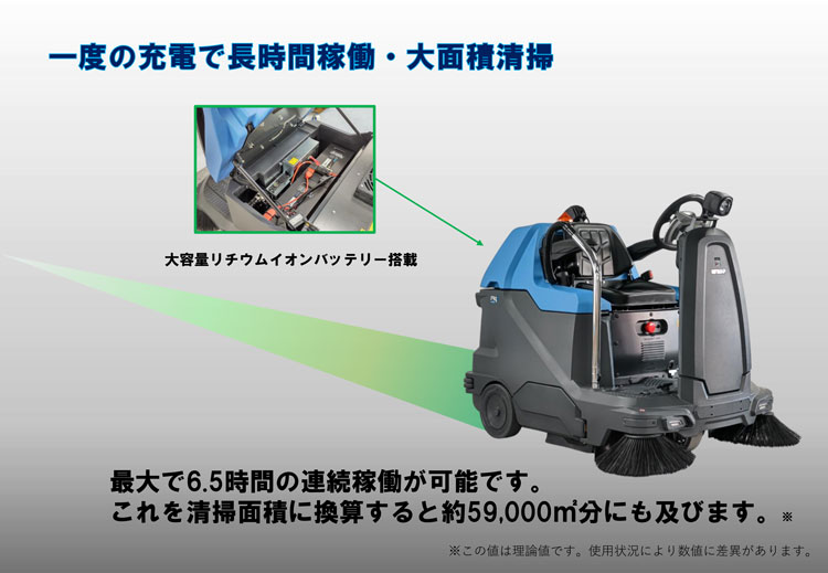 大容量リチウムイオンバッテリー搭載で、最大6.5時間の連続稼働が可能です。約59,000 m²分の清掃面積をカバーします。